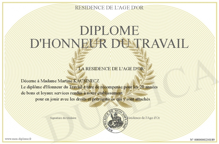 Envoyez par email votre Diplôme d'Honneur du Travail personalisé