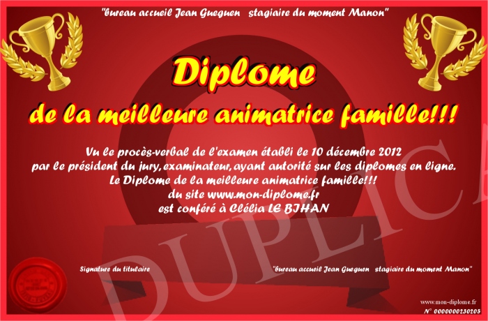 Envoyez par email votre Diplôme de la meilleure animatrice famille!!! personalisé