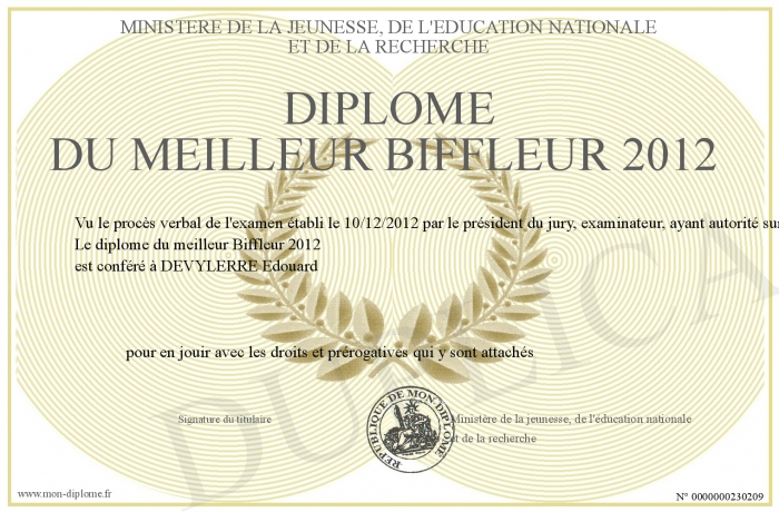 Envoyez par email votre Diplôme du meilleur Biffleur 2012 personalisé