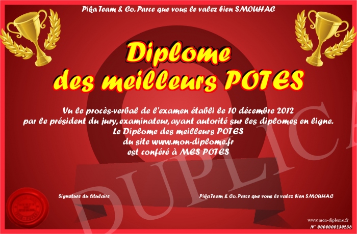 Envoyez par email votre Diplôme des meilleurs POTES personalisé