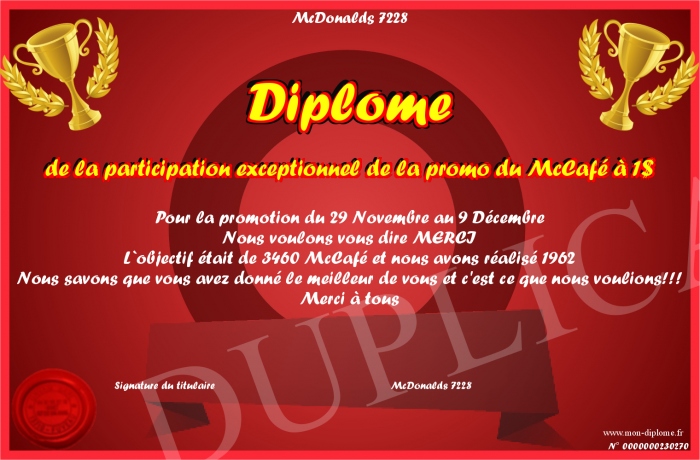 Envoyez par email votre Diplôme de la participation exceptionnel de la promo du McCafé à 1$ personalisé