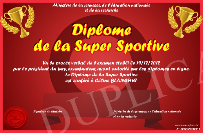 Envoyez par email votre Diplôme de la Super Sportive personalisé