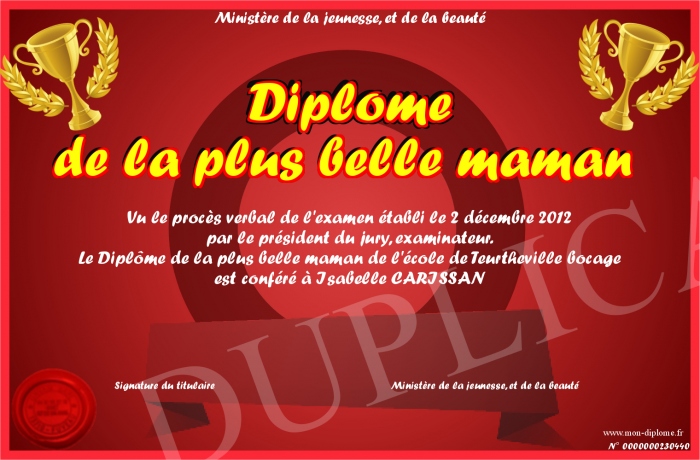 Envoyez par email votre Diplôme de la plus belle maman personalisé