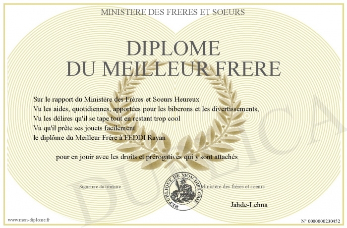 Envoyez par email votre Diplôme du Meilleur Frère personalisé