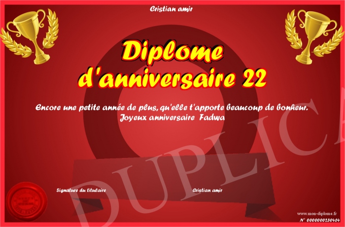 Envoyez par email votre Diplôme d'anniversaire 22 personalisé