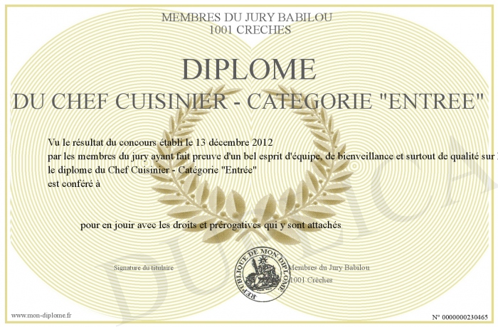 Envoyez par email votre Diplôme du Chef Cuisinier - Catégorie -Entrée- personalisé