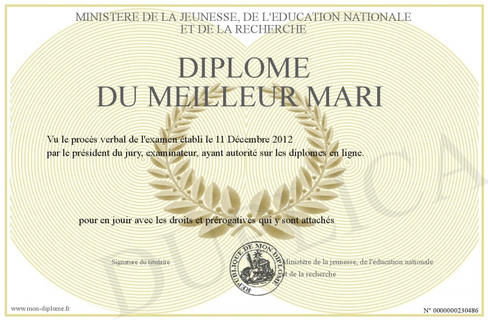 Envoyez par email votre Diplôme du Meilleur Mari personalisé