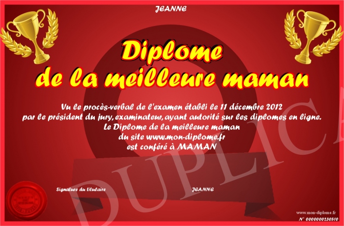 Envoyez par email votre Diplôme de la meilleure maman personalisé