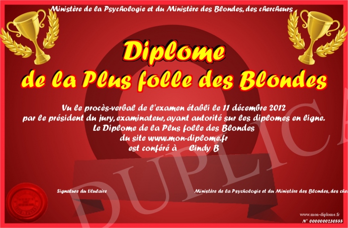 Envoyez par email votre Diplôme de la Plus folle des Blondes personalisé