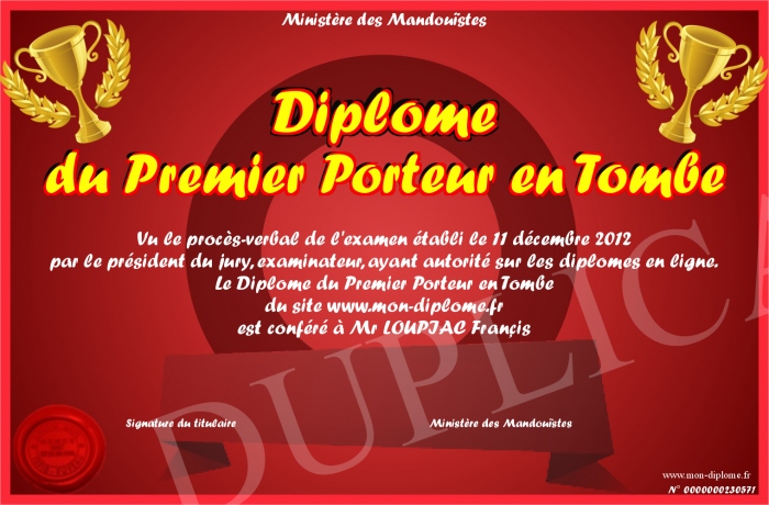 Envoyez par email votre Diplôme du Premier Porteur en Tombe personalisé