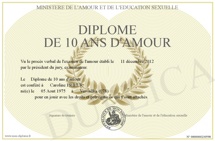 Envoyez par email votre Diplôme de 10 ans d'amour personalisé