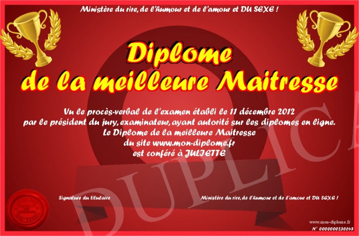 Envoyez par email votre Diplome de la meilleure Maitresse personalisé