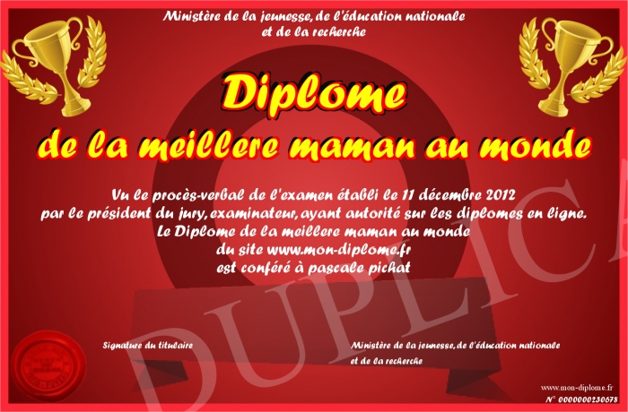 Envoyez par email votre Diplôme de la meillere maman au monde personalisé