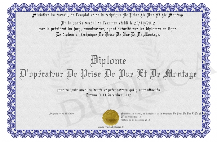 Envoyez par email votre Diplome D'opérateur De Prise De Vue Et De Montage personalisé