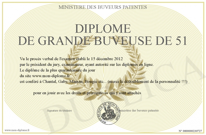 Envoyez par email votre Diplôme de grande buveuse de 51 personalisé
