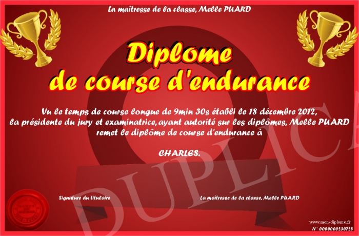 Envoyez par email votre Diplôme de course d'endurance personalisé
