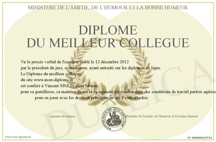 Envoyez par email votre Diplôme du meilleur collègue personalisé