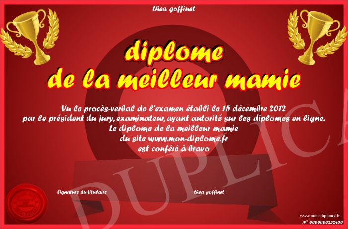 Envoyez par email votre diplome de la meilleur mamie personalisé