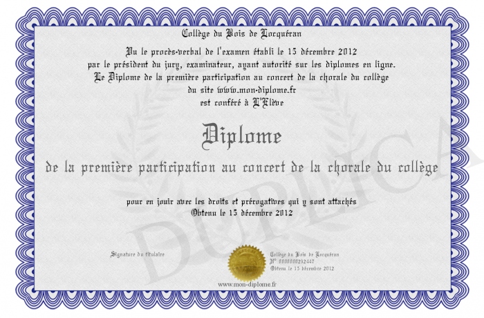 Envoyez par email votre Diplôme de la première participation au concert de la chorale du collège personalisé