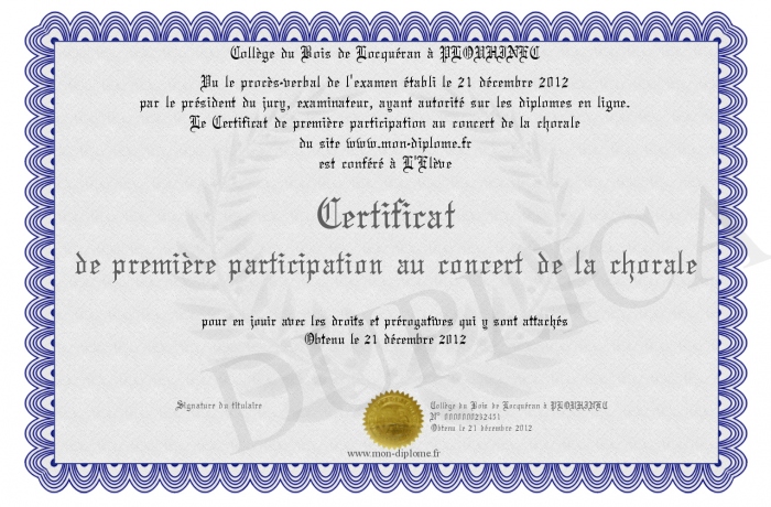 Envoyez par email votre Certificat de première participation au concert de la chorale personalisé