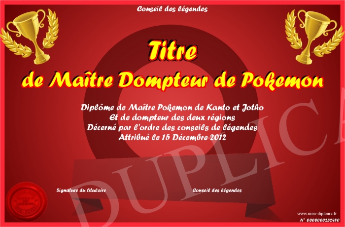 Envoyez par email votre Titre de Maître Dompteur de Pokemon personalisé