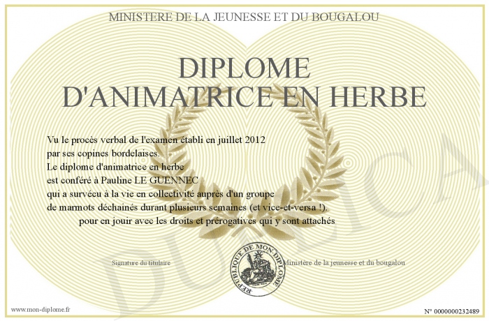 Envoyez par email votre Diplôme d'animatrice en herbe personalisé