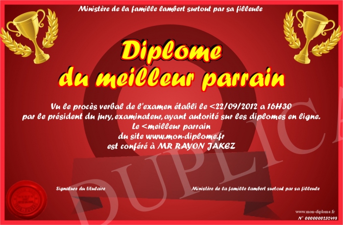 Envoyez par email votre Diplôme du meilleur parrain personalisé