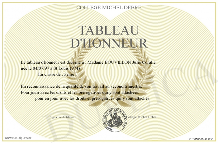 Envoyez par email votre TABLEAU D'HONNEUR personalisé