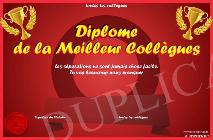 Envoyez par email votre Diplôme de la Meilleur Collègues personalisé