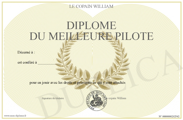 Envoyez par email votre Diplôme du meilleure pilote personalisé