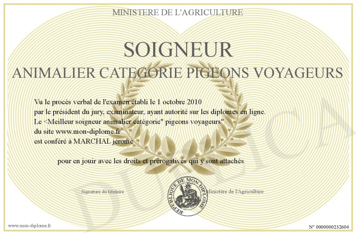 Envoyez par email votre Soigneur animalier categorie pigeons voyageurs personalisé