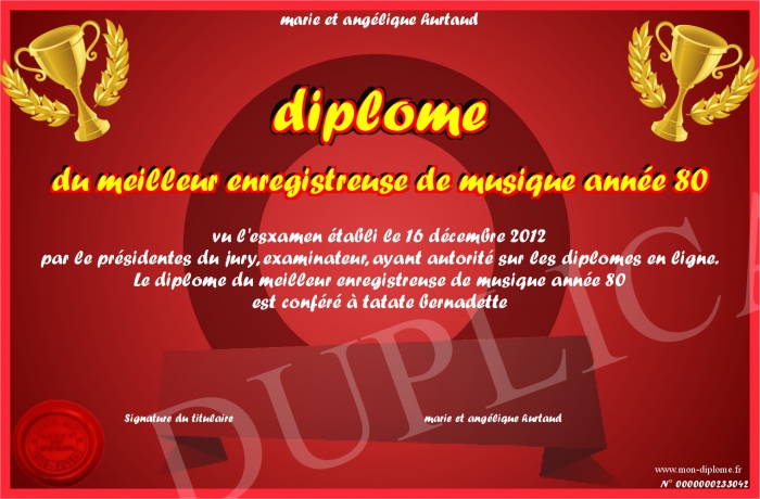 Envoyez par email votre diplome du meilleur enregistreuse de musique année 80 personalisé