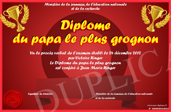 Envoyez par email votre Diplôme du papa le plus grognon personalisé