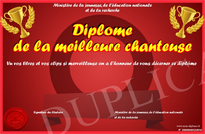 Envoyez par email votre Diplôme de la meilleure chanteuse personalisé
