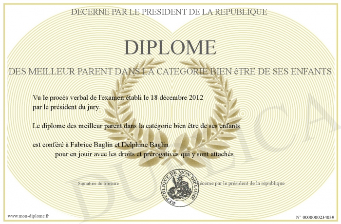 Envoyez par email votre diplôme des meilleur parent dans la catégorie bien être de ses enfants personalisé