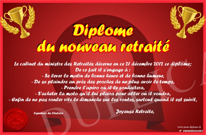 Envoyez par email votre Diplôme du nouveau retraité personalisé