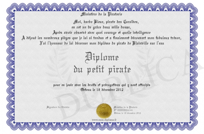 Envoyez par email votre Diplôme du petit pirate personalisé