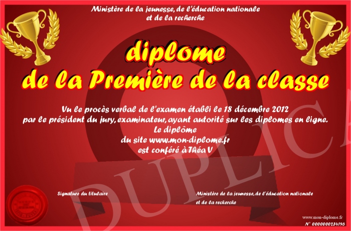 Envoyez par email votre diplôme de la Première de la classe personalisé