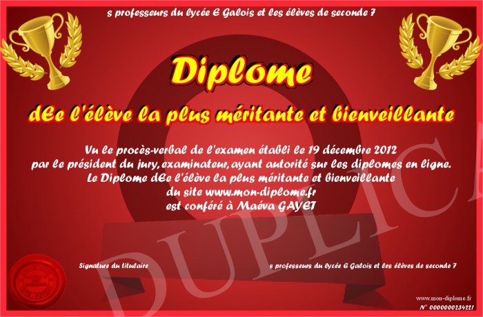 Envoyez par email votre Diplôme dEe l'élève la plus méritante et bienveillante personalisé