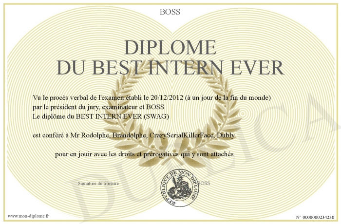 Envoyez par email votre Diplôme du BEST INTERN EVER personalisé