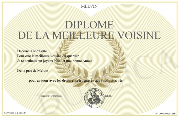 Envoyez par email votre Diplôme de la meilleure Voisine personalisé
