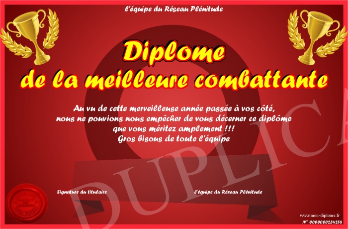 Envoyez par email votre Diplôme de la meilleure combattante personalisé