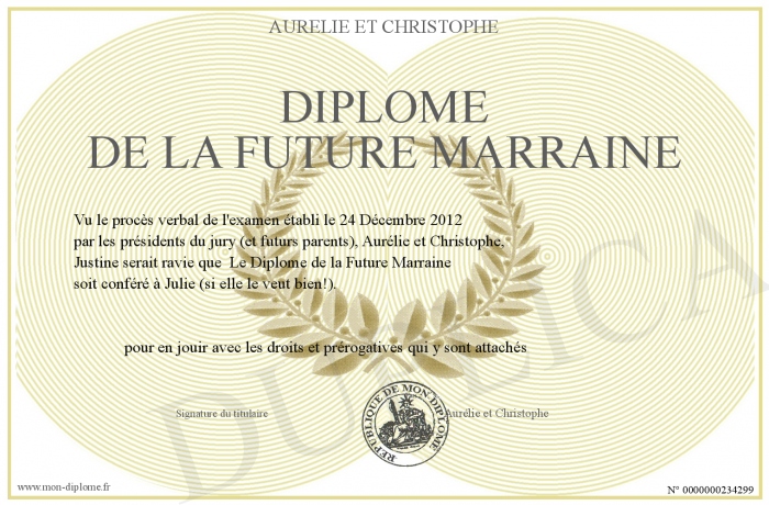 Envoyez par email votre Diplôme de la Future Marraine personalisé