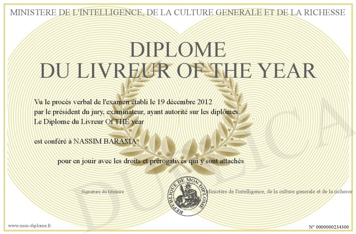 Envoyez par email votre Diplome du Livreur Of THE year personalisé