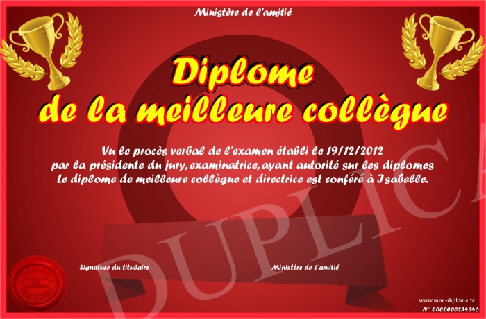 Envoyez par email votre Diplôme de la meilleure collègue personalisé
