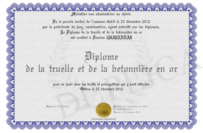 Envoyez par email votre Diplôme de la truelle et de la betonnière en or personalisé