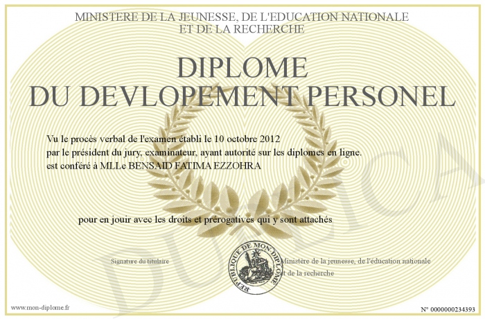 Envoyez par email votre Diplôme du DEVLOPEMENT PERSONEL personalisé