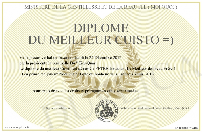 Envoyez par email votre Diplome Du Meilleur CuistO =) personalisé