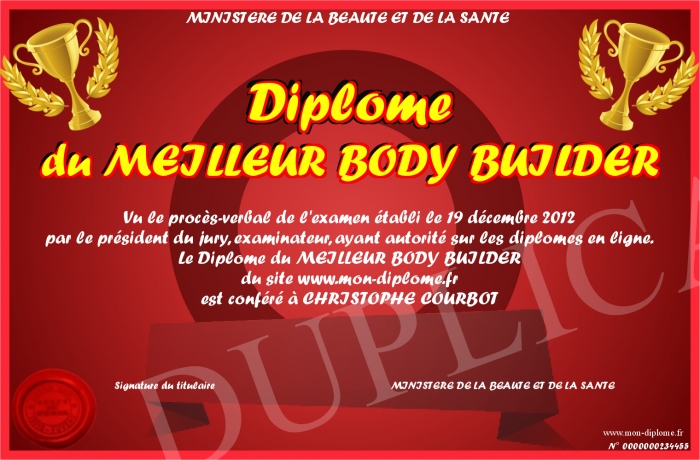 Envoyez par email votre Diplôme du MEILLEUR BODY BUILDER personalisé