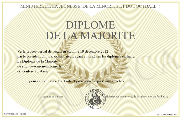 Envoyez par email votre Diplôme de la Majorité personalisé